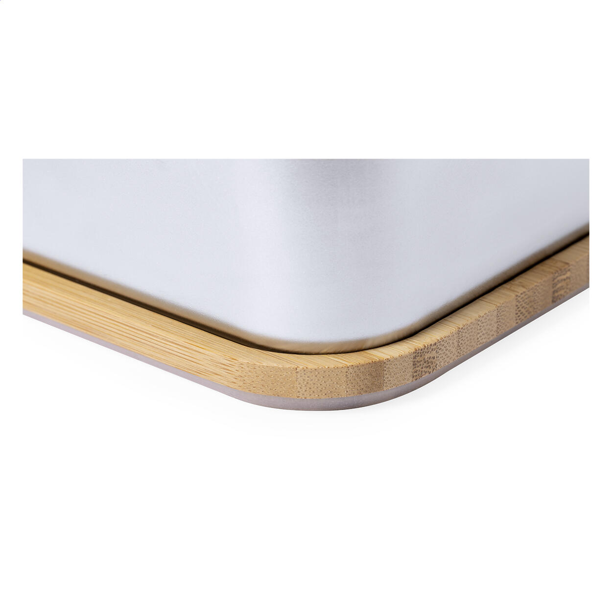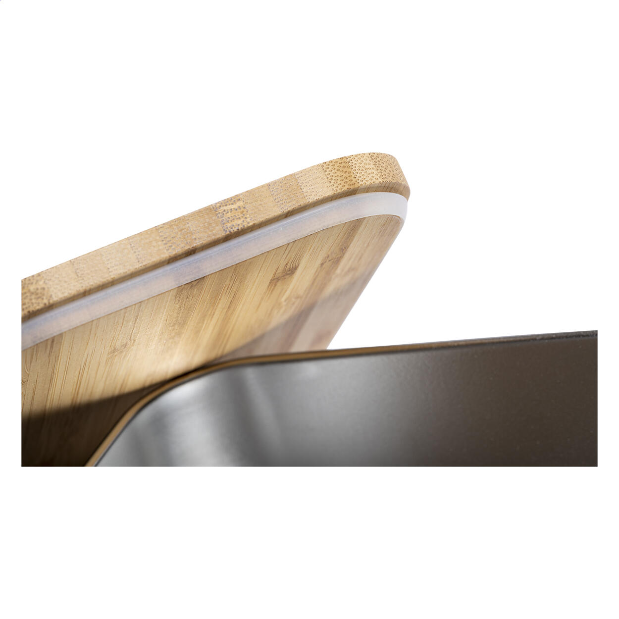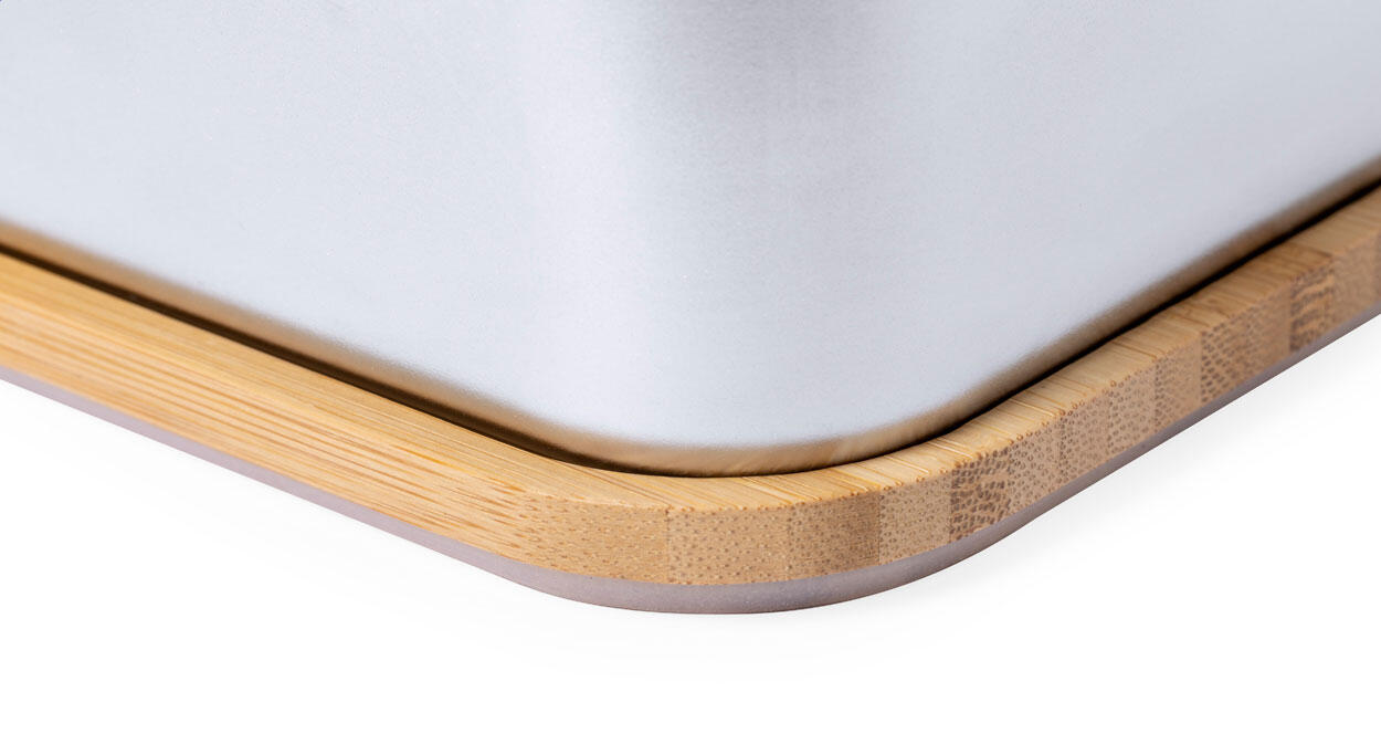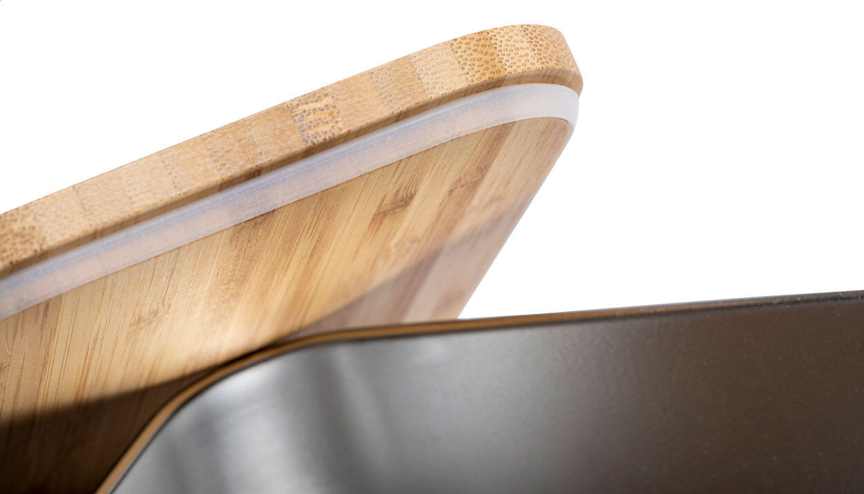 Lunchbox aus Edelstahl mit Bambusdeckel. Mit Bambusbesteck (Messer und Gabel) und elastischem Band, 600 ml Füllmenge.