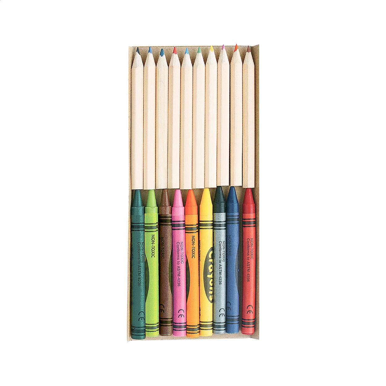 Farbige Buntstifte (10 St.) und Wachsmalstifte (9 St.) als Set im Karton aus recycelter Pappe mit Sichtfenster.