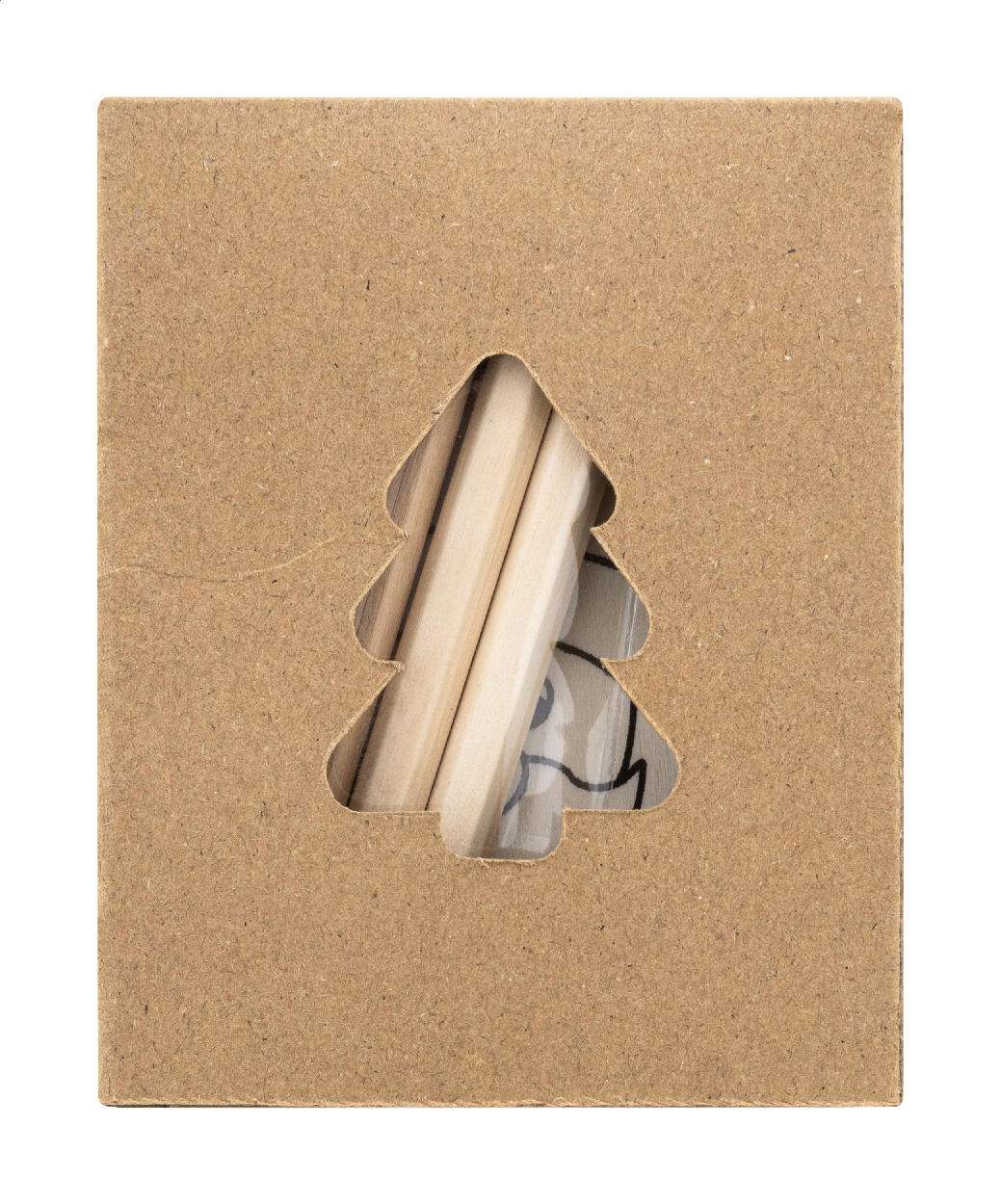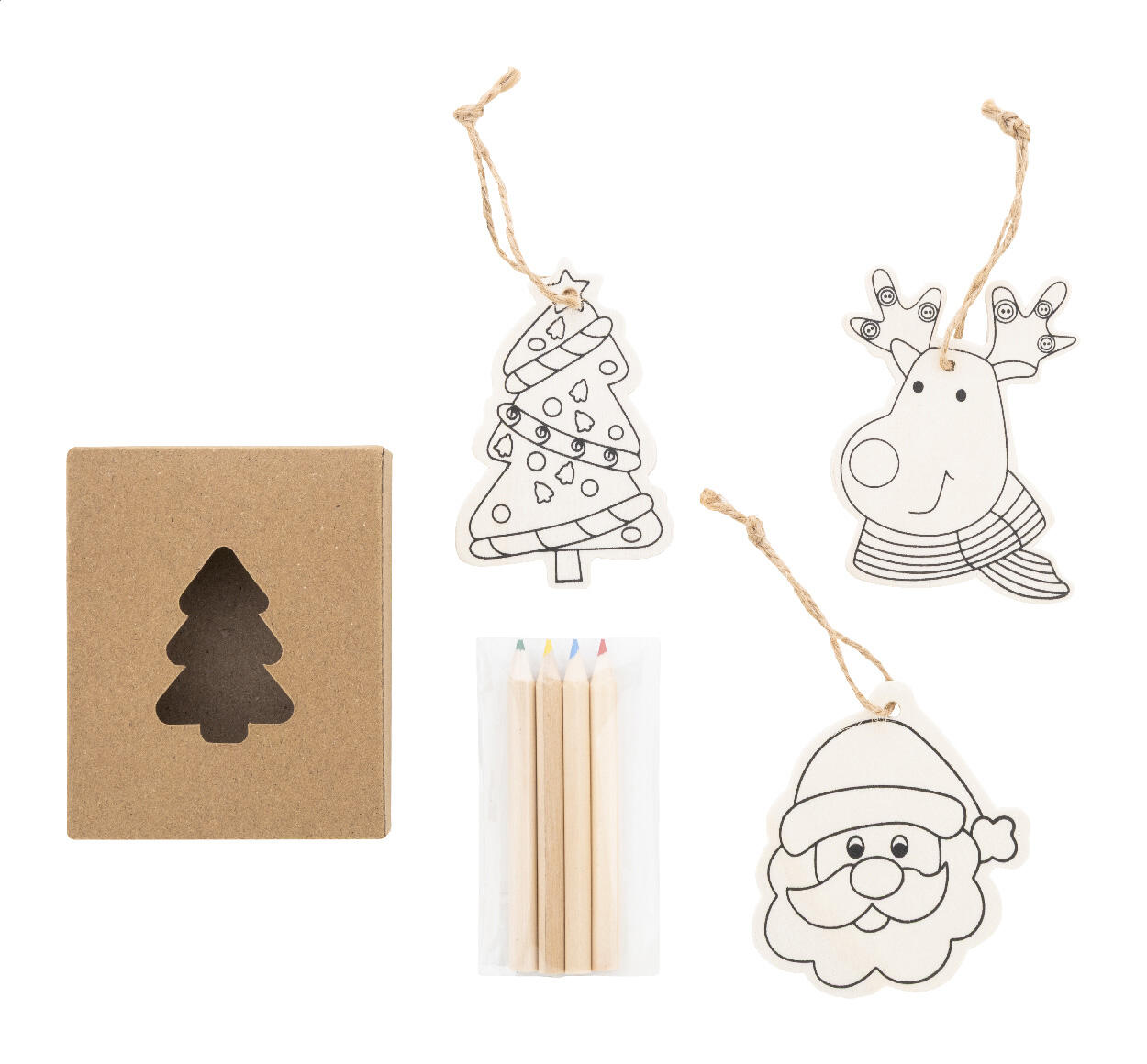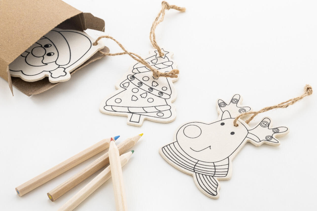 Christbaumschmuck-Set zum Bemalen in Kraftpapierbox mit ausgestanztem Weihnachtsbaum. Inhalt: 3 Holzanhänger mit Hanfkordel und 4 Buntstiften.
