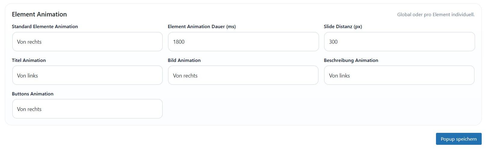 • Popup Animation + Element Animation (Titel, Bild, Text, Button)