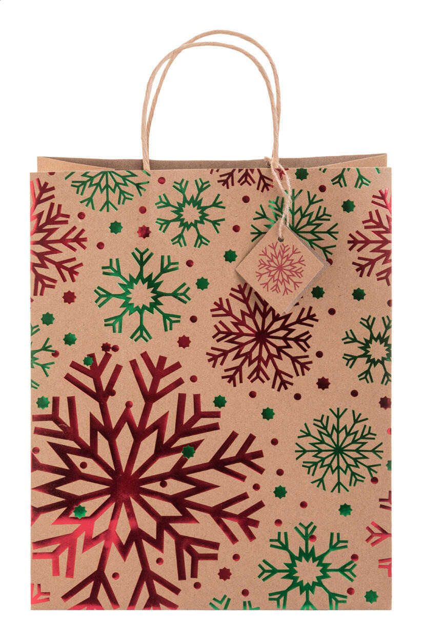 Geschenktasche aus recyceltem Kraftpapier mit Weihnachtsmotiven, Griffen und Geschenkanhänger. Material: 140 g/m².