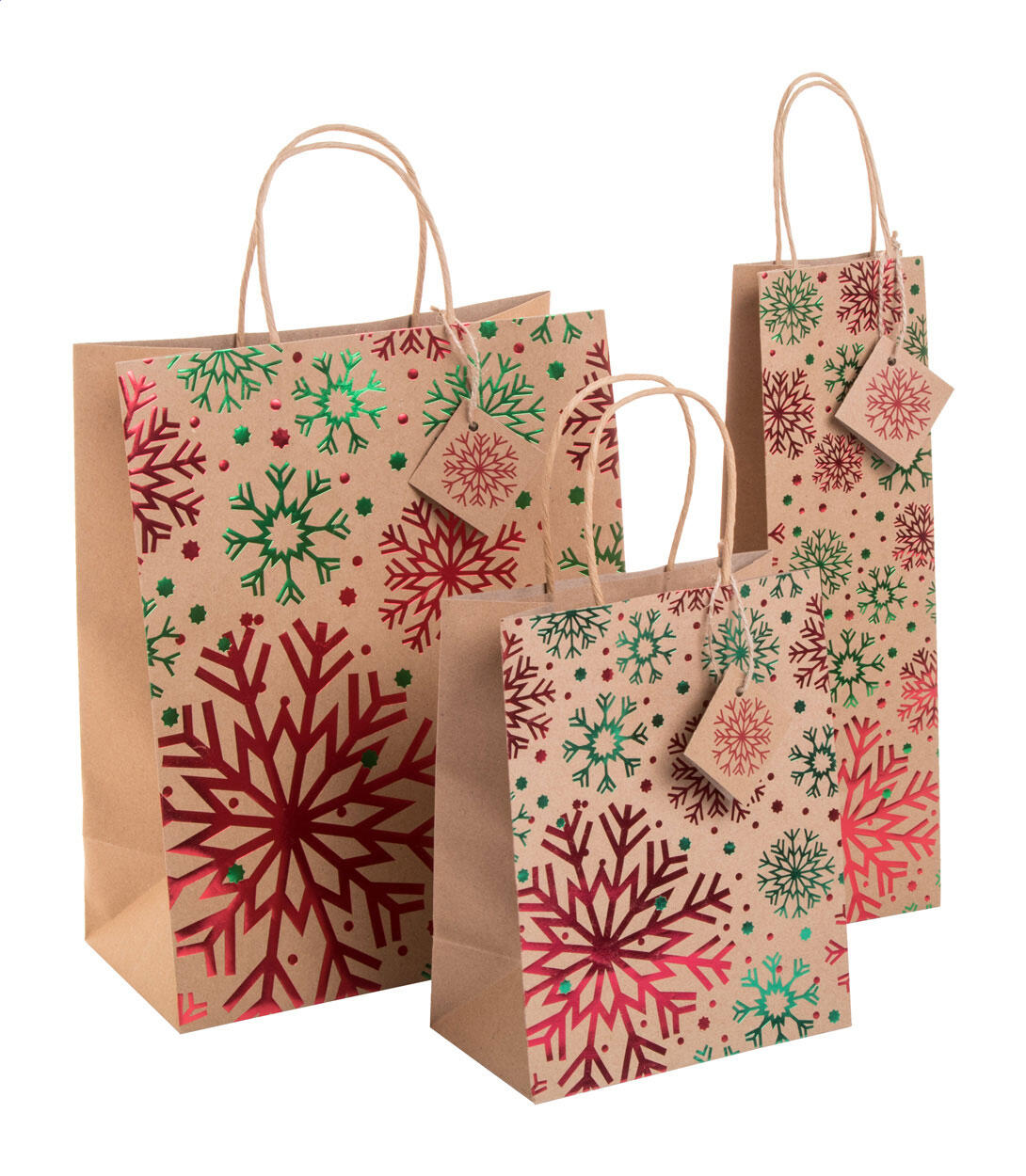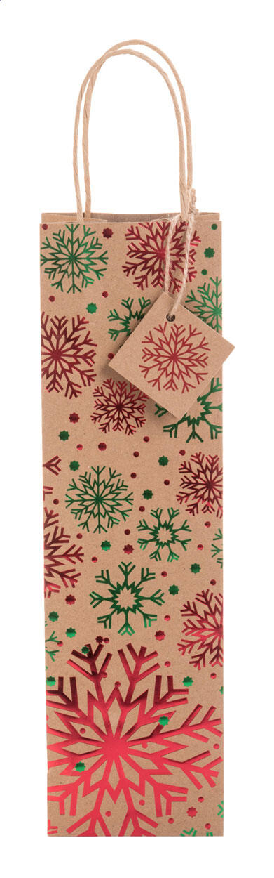 Geschenktasche für Weinflaschen aus recyceltem Kraftpapier mit Weihnachtsmotiven, Griffen und Geschenkanhänger. Material: 140 g/m².