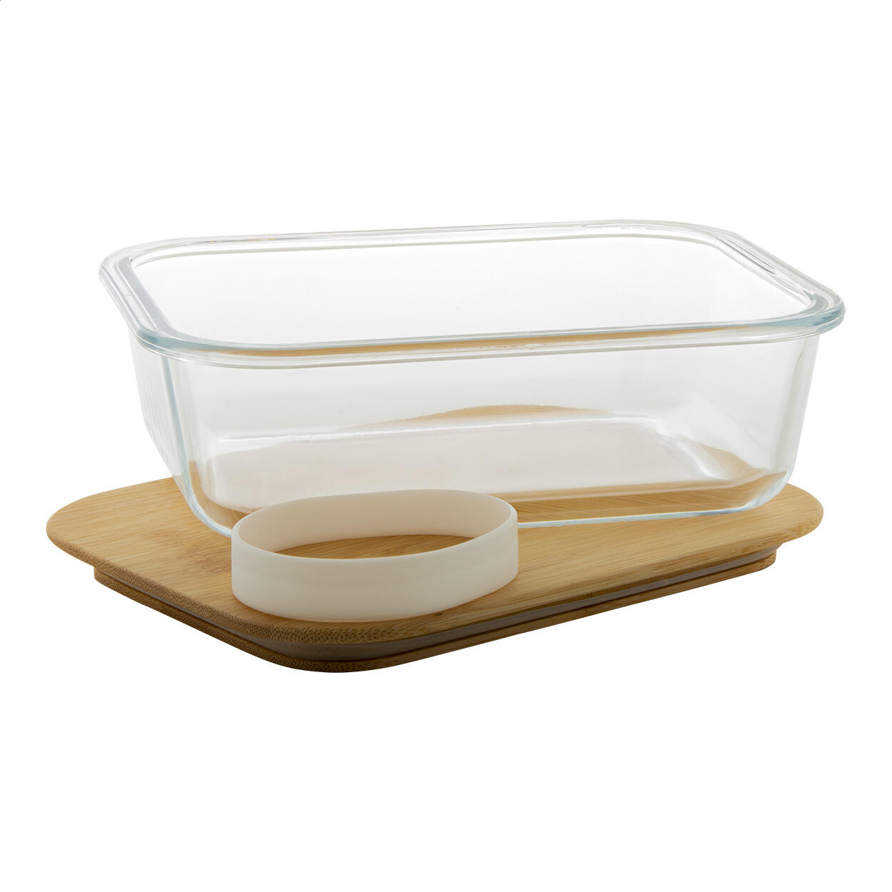 Lunchbox aus Glas mit Deckel aus natürlichem Bambus und Silikonband. Füllmenge: 800 ml.