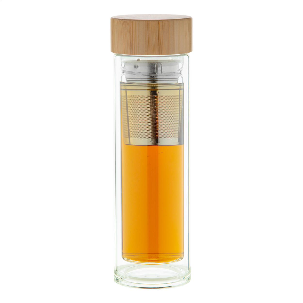 Doppelwandige Isolierflasche aus Borosilikatglas mit Tee-Ei und Bambusdeckel. Füllmenge: 420 ml.