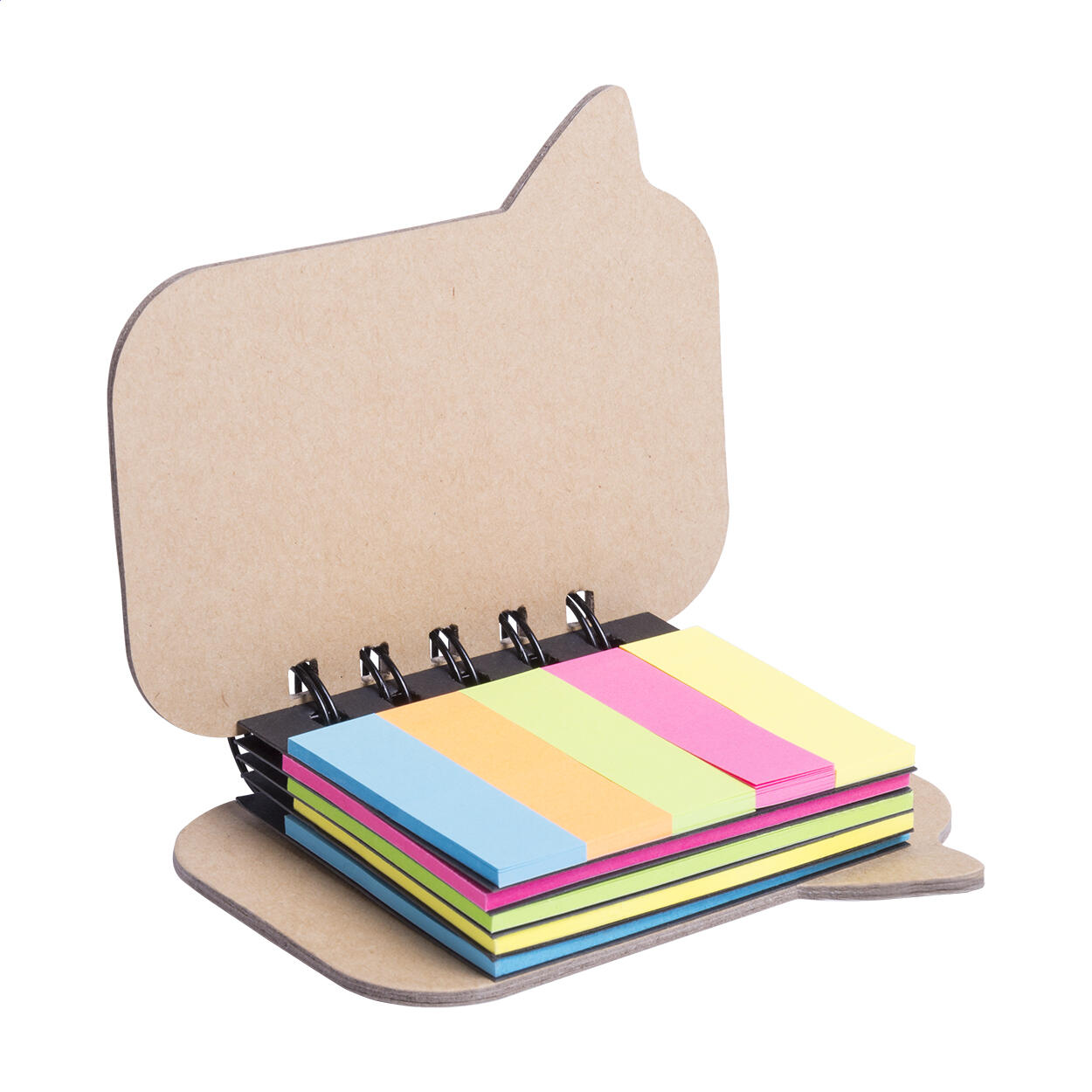 Haftnotiz-Set mit Umschlag aus Recyclingpapier in Form einer Sprechblase, beinhaltet verschiedene Haftnotizgrößen: 5,1×7,5cm: 100 Stk. und 1,5×5,1: 125 Stk.