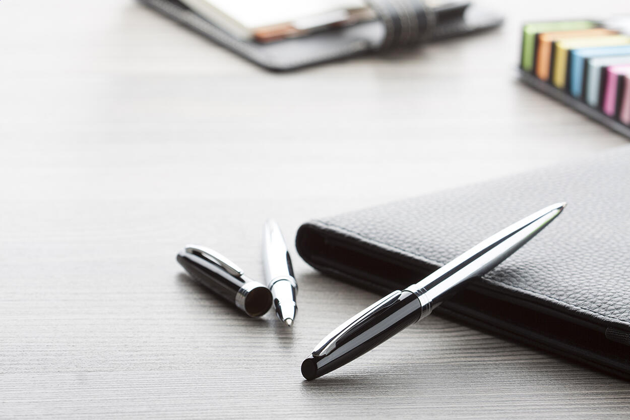 Metall-Schreibset, bestehend aus Kugelschreiber und Rollerball mit verchromtem Schaft und schwarz lackierten Kappe, blauschreibend. Einzeln in Geschenkbox.