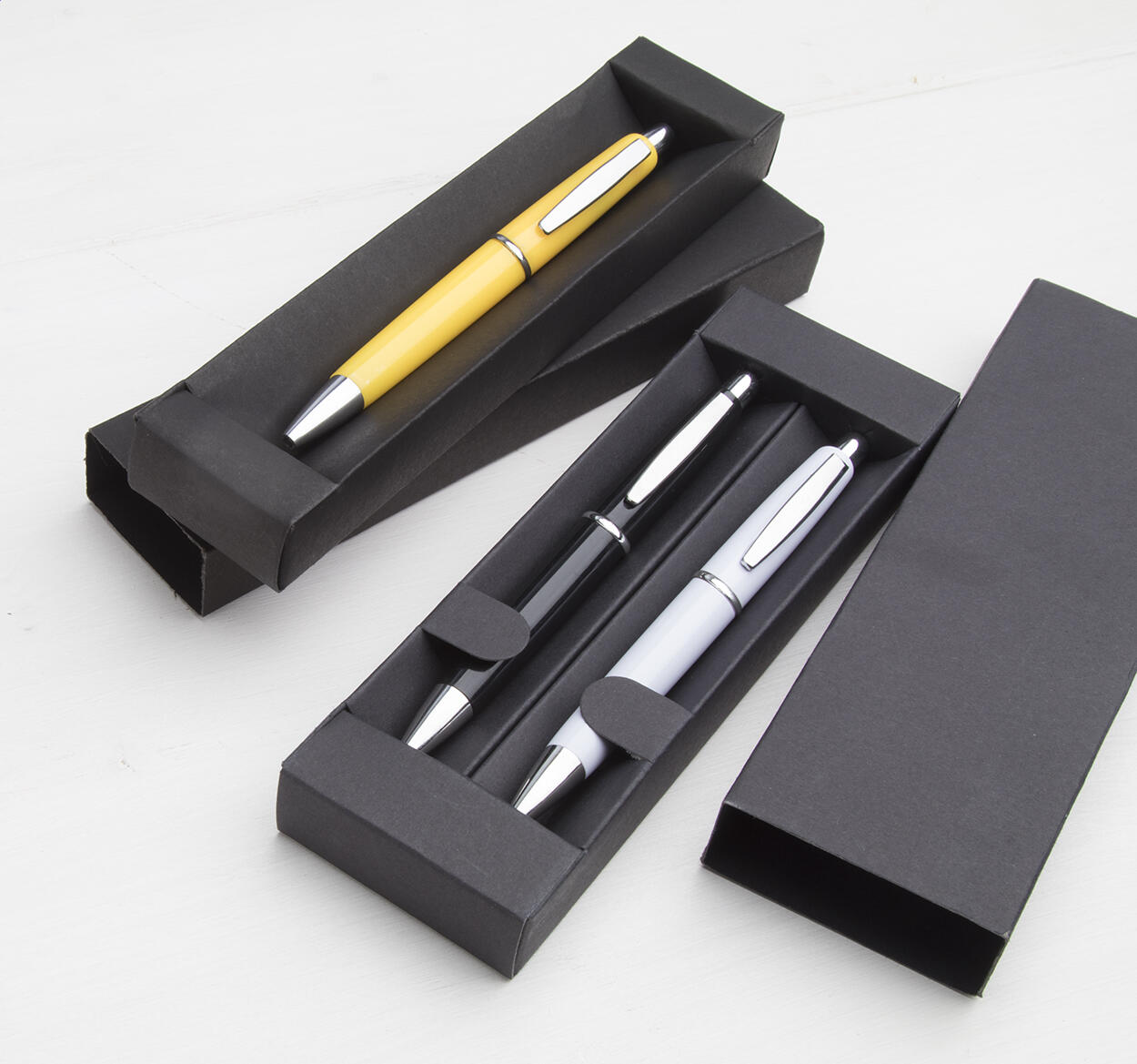 Schwarze Geschenkbox aus Pappe für zwei Schreibgeräte.