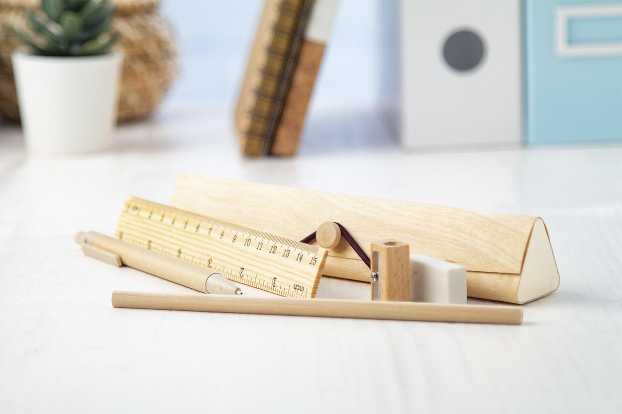 5-teiliges Schreibset aus Holz in einem Holzstiftetui. Inklusive Kugelschreiber aus Recyclingpapier (blauschreibend), Bleistift (HB, ungespitzt), 15 cm Lineal, Anspitzer und Radiergummi.