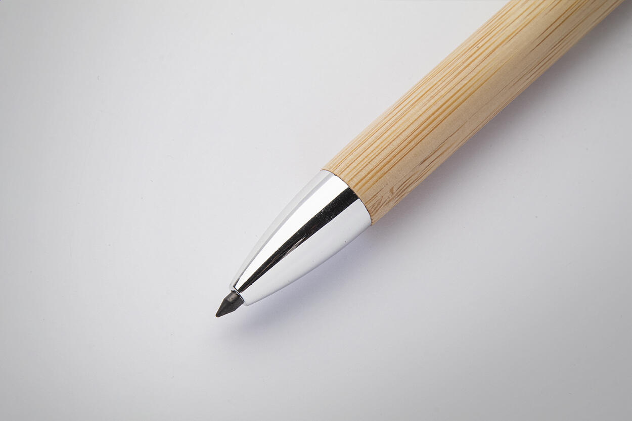 Tintenloser Bambusstift mit Metallapplikationen. Mit Metalllegierungsspitze, die das Papier oxidiert. Dieser Stift schreibt ähnlich wie ein Bleistift und ist zudem radierbar.