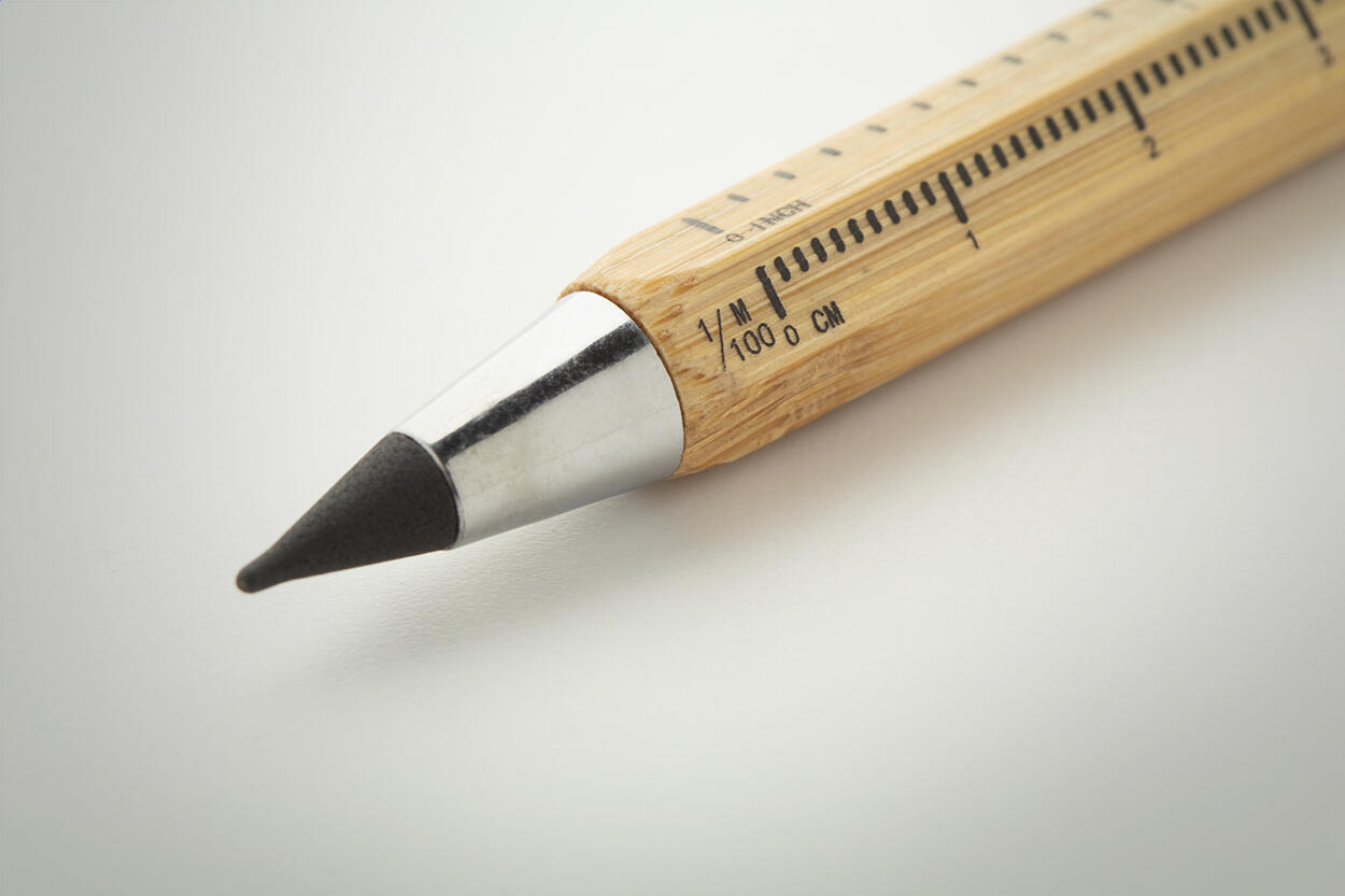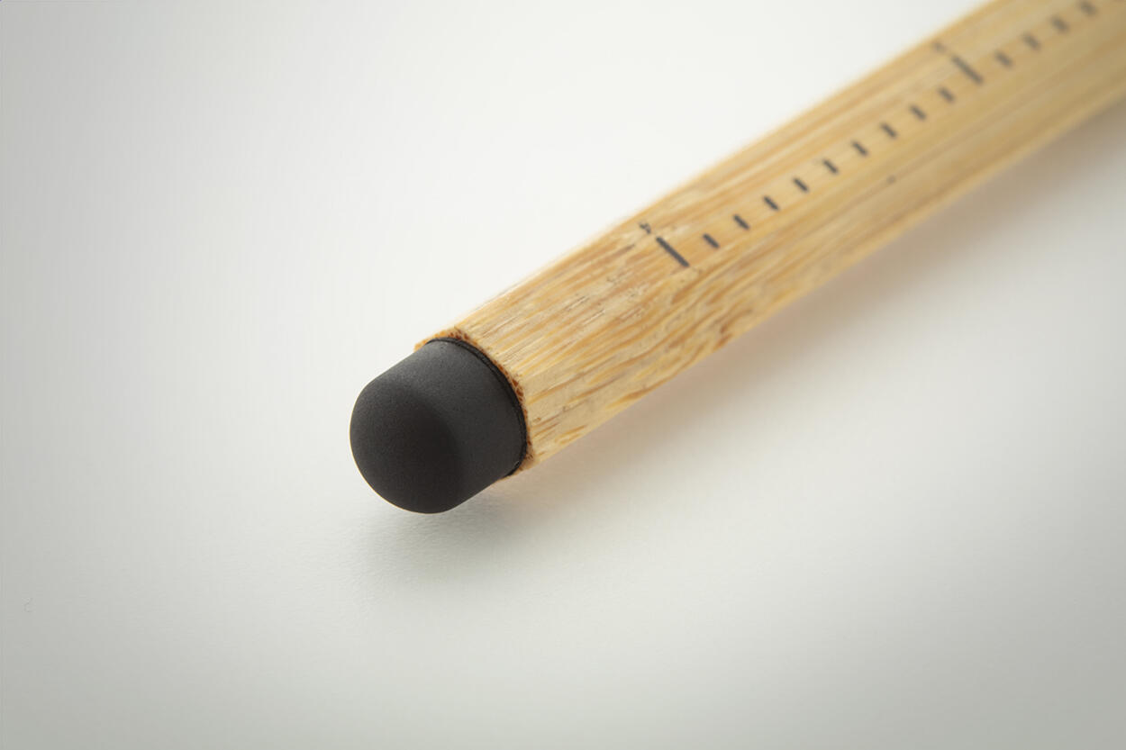Langlebiger, tintenloser Stift aus Bambus mit Touch-Stylus und Metalllegierungsspitze, die das Papier oxidiert. Mit sechseckigem Schaft inklusive 11 cm und 4 Zoll Linealen. Dieser Stift schreibt ähnlich wie ein Bleistift und ist zudem radierbar.